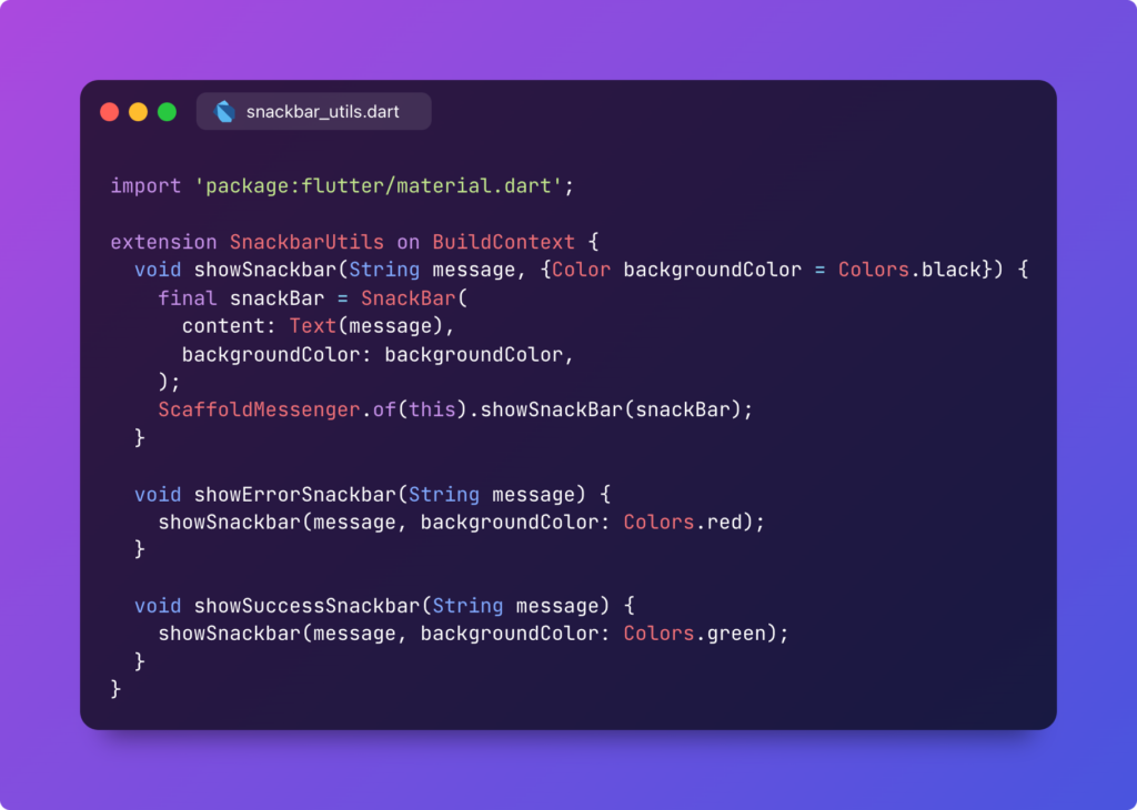 This extension adds snackbar functionality directly to the BuildContext, allowing for quick and easy display of messages. Usage Benefits Full Code
